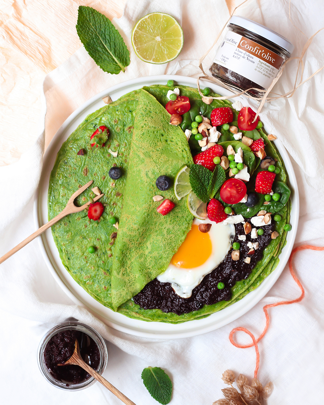 Dressage d’un crêpe : Déposer votre crêpe dans une assiette plate. Napper une partie de votre crêpe avec une bonne cuillère de confit’olive de Nyons. Déposer l'œuf par-dessus. Sur l’autre partie de la crêpe mettre les épinards, les morceaux de fraises & myrtilles, les tomates cerises, les cubes de fromages de chèvre, les petits pois, les noisettes et les feuilles de menthe. Assaisonnez d’un filet d’huile d’olive de Nyons et de citron vert, sel et poivre.