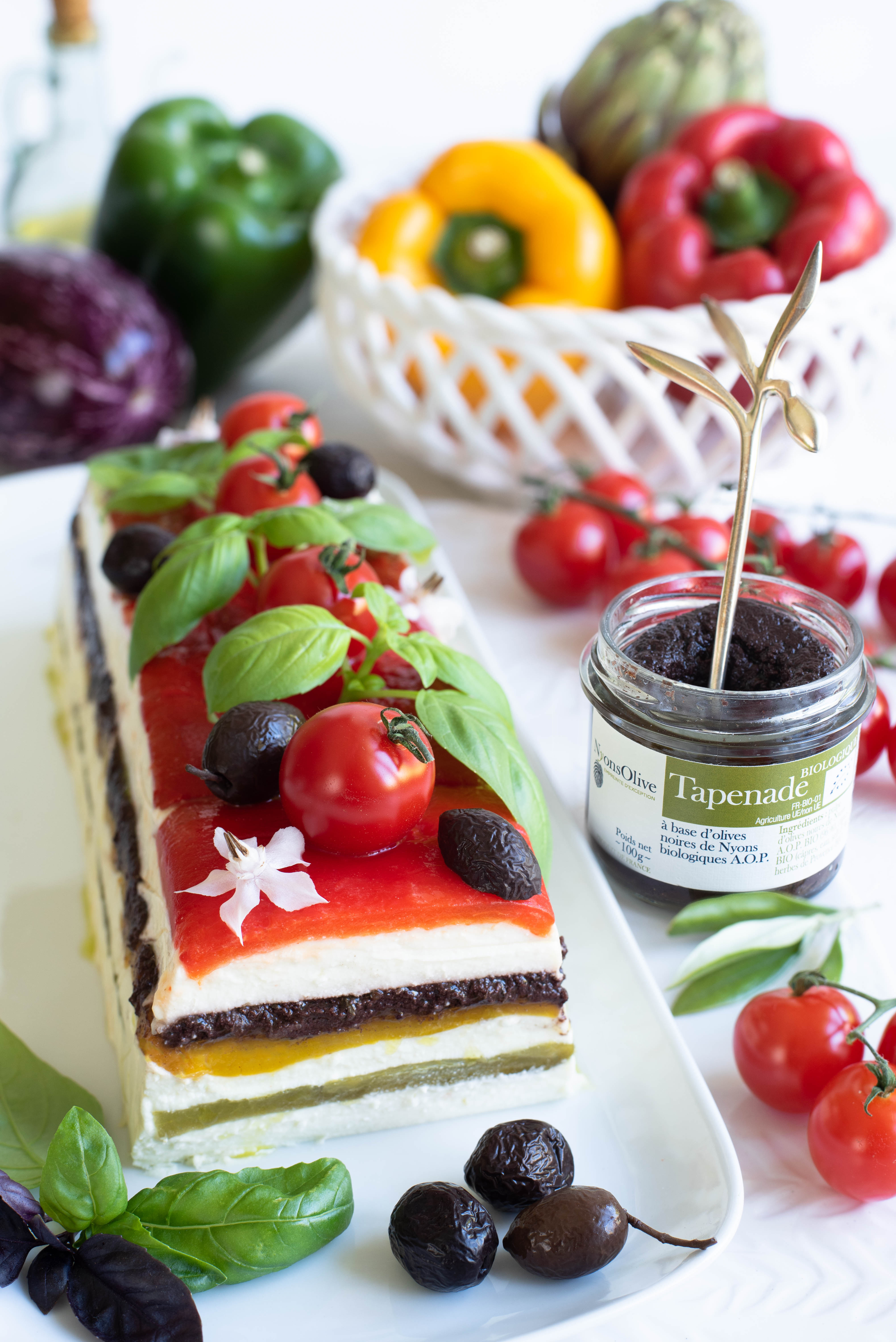 - Décorez la terrine avec les tomates cerises, les feuilles de basilic et les olives de Nyons.