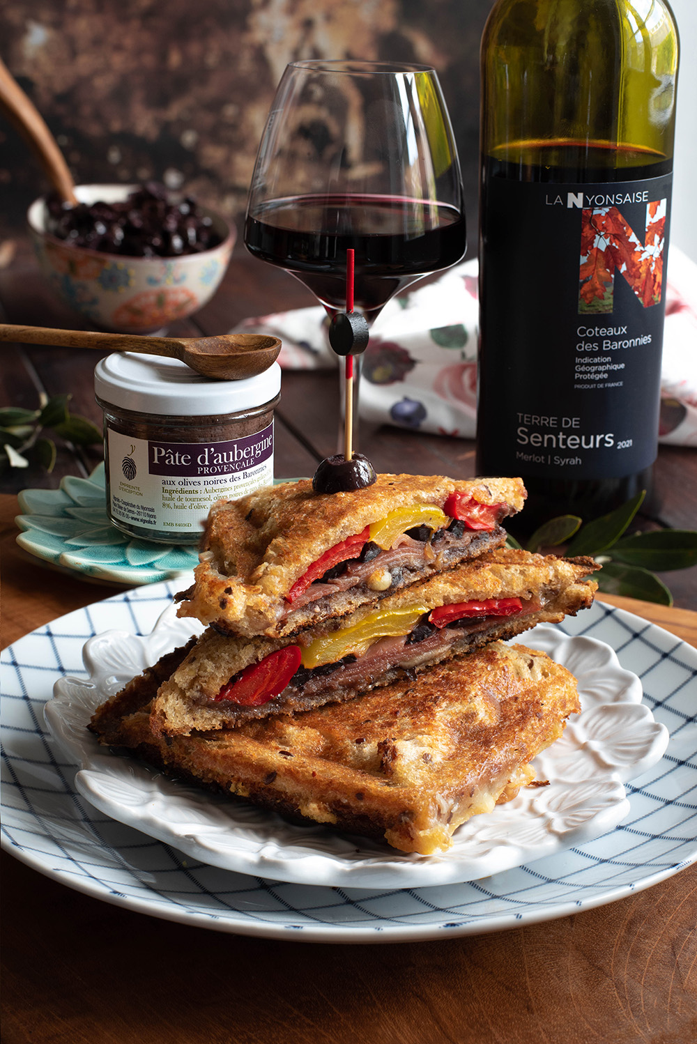 - Tartinez la pâte d’aubergine provençale aux olives de Baronnies sur l’intérieur des tranches de pain de mie déjà beurrées.